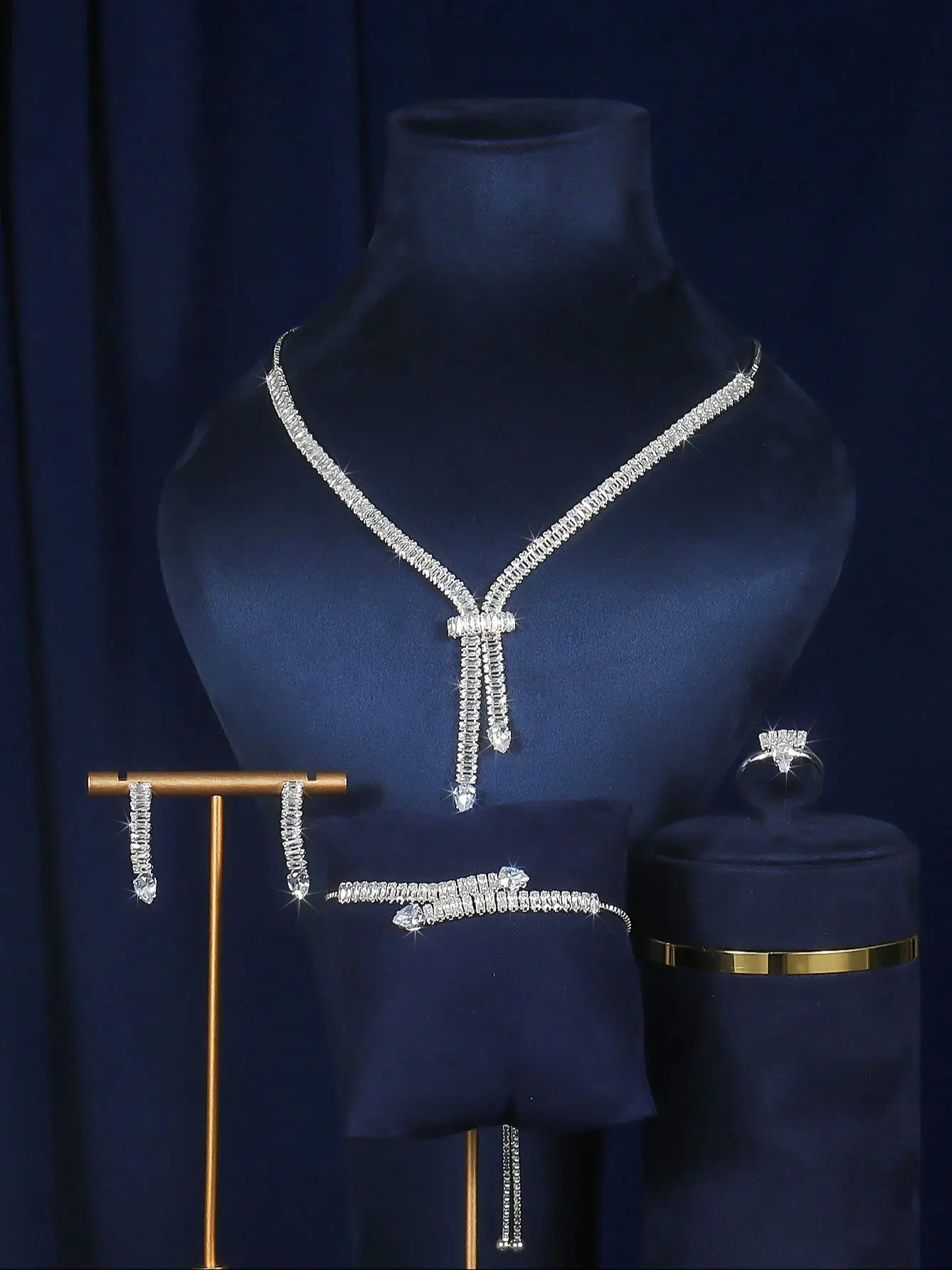 Indulge in the radiant beauty of this meticulously designed four-piece luxury jewelry set, a celebration of sophistication and grace. Featuring a matching necklace, earrings, ring, and bracelet, each piece is adorned with dazzling water drop-shaped cubic zirconia, expertly cut to mirror the brilliance of fine diamonds.